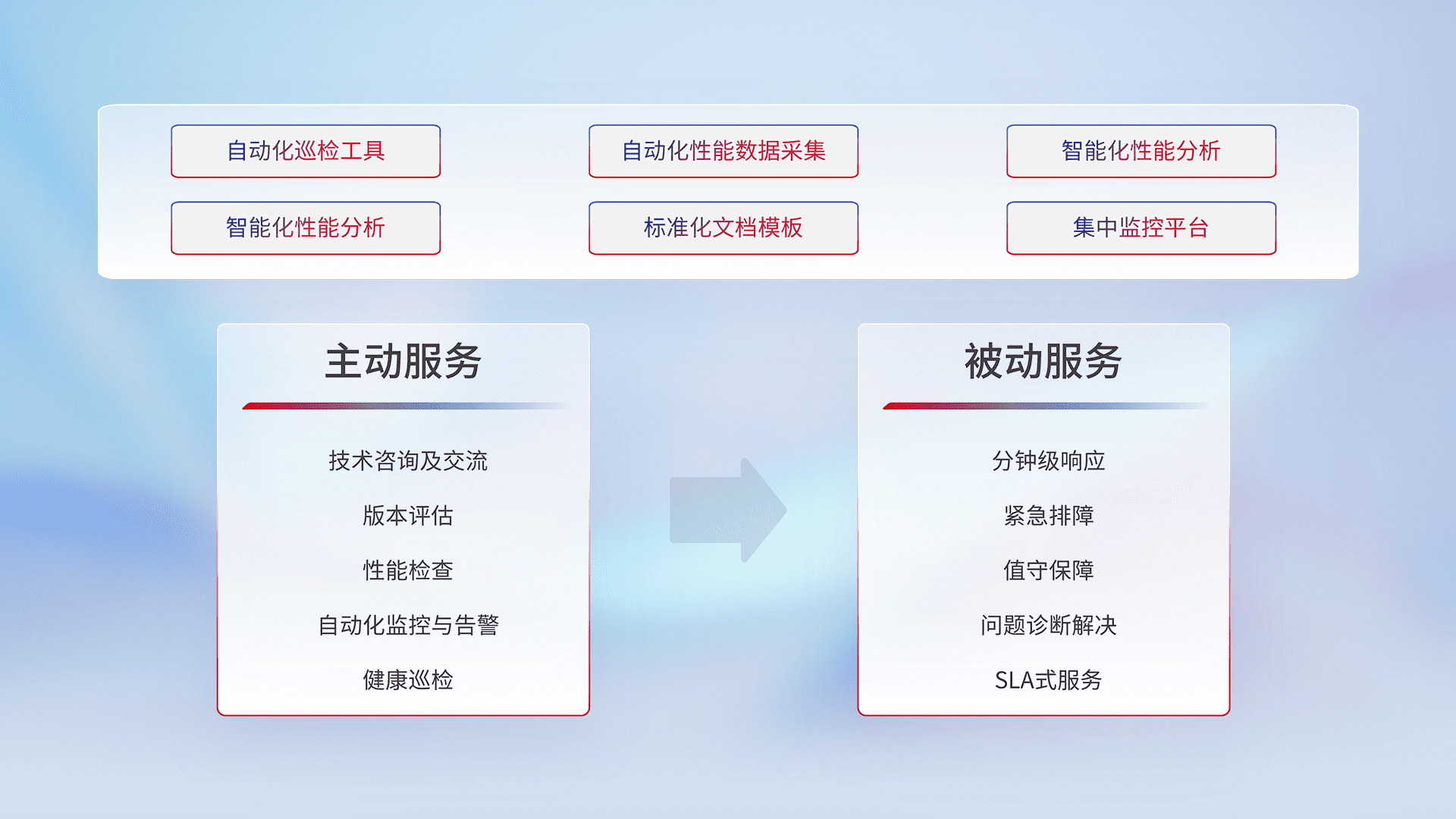 智能化工具和标准化文档,,保障服务质量,,提供主动服务(包含技术咨询、、、版本评估、、、、性能检查、、、、自动化监控与告警、、健康巡检)和被动服务包含(分钟级响应、、、紧急排障、、、、值守保障、、、问题诊断解决、、、SLA服务)。。。